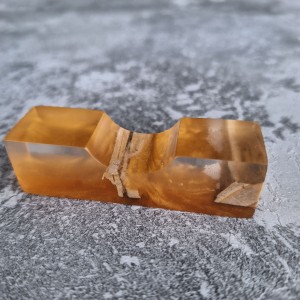 Podstawka wykonana jest z żywicy epoksydowej. W górnej części bezbarwna, w dolnej - złota. W środku zostały zatopione kawałki drewna.